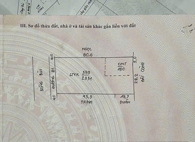 - Tổng diện tích: 2.511 m2 trong đó có 180 m² đất ở lâu dài